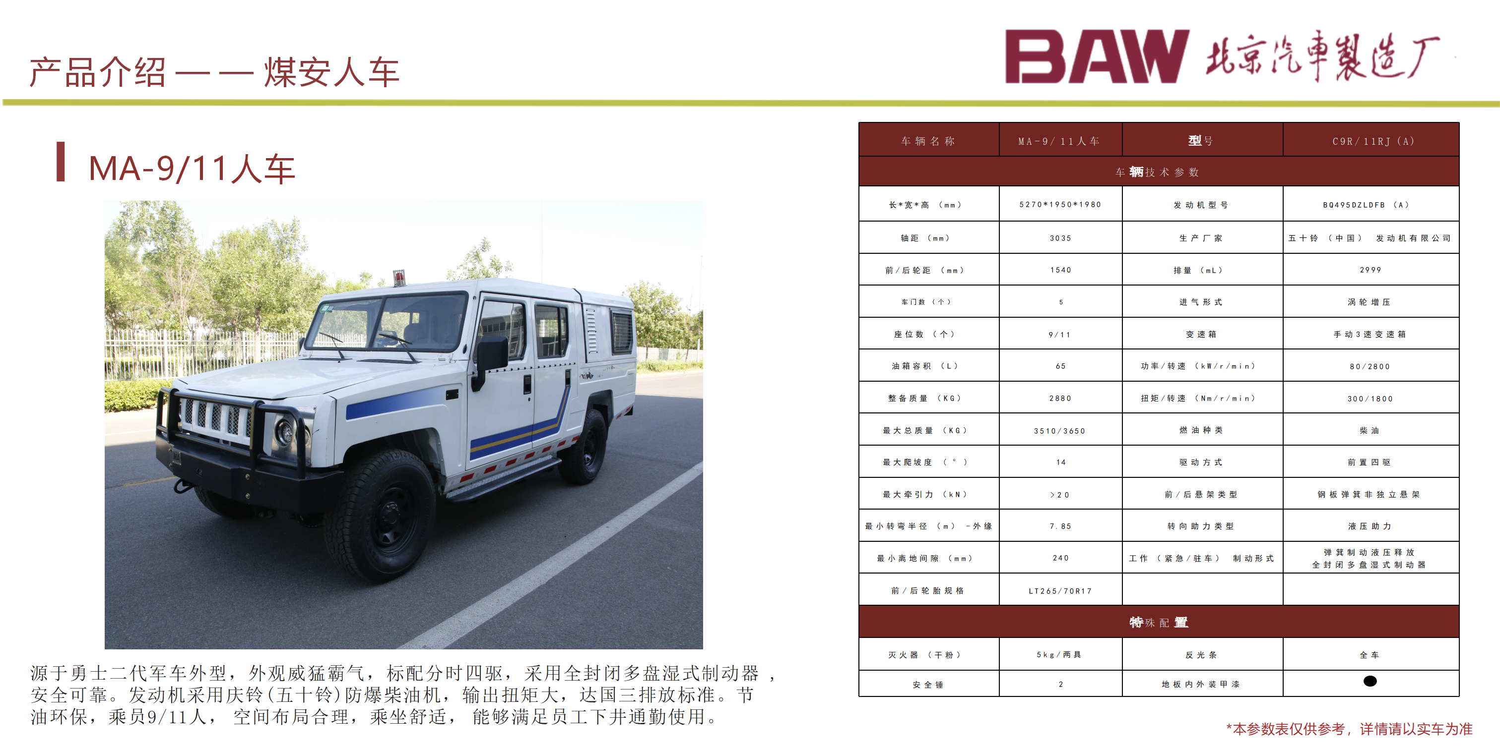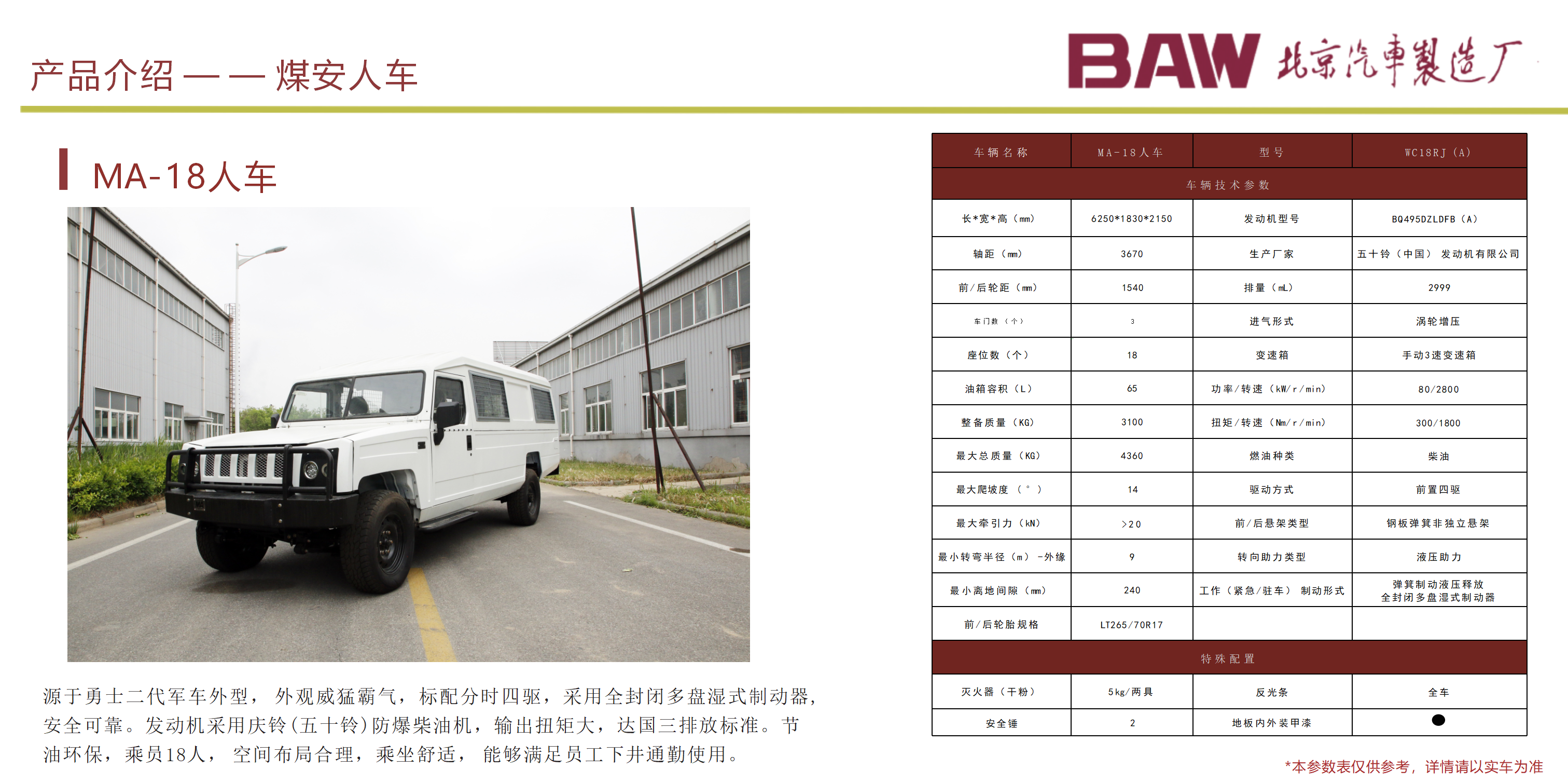 煤安車系列源于勇士二代軍車外型, 外觀威猛霸氣,標配分時四驅,采用全封閉多盤濕式制動器, 安全可靠。發動機采用慶鈴(五十鈴)防爆柴油機,輸出扭矩大,達國三排放標準。節油環保, 空間布局合理,乘坐舒適, 能夠滿足員工下井通勤使用。