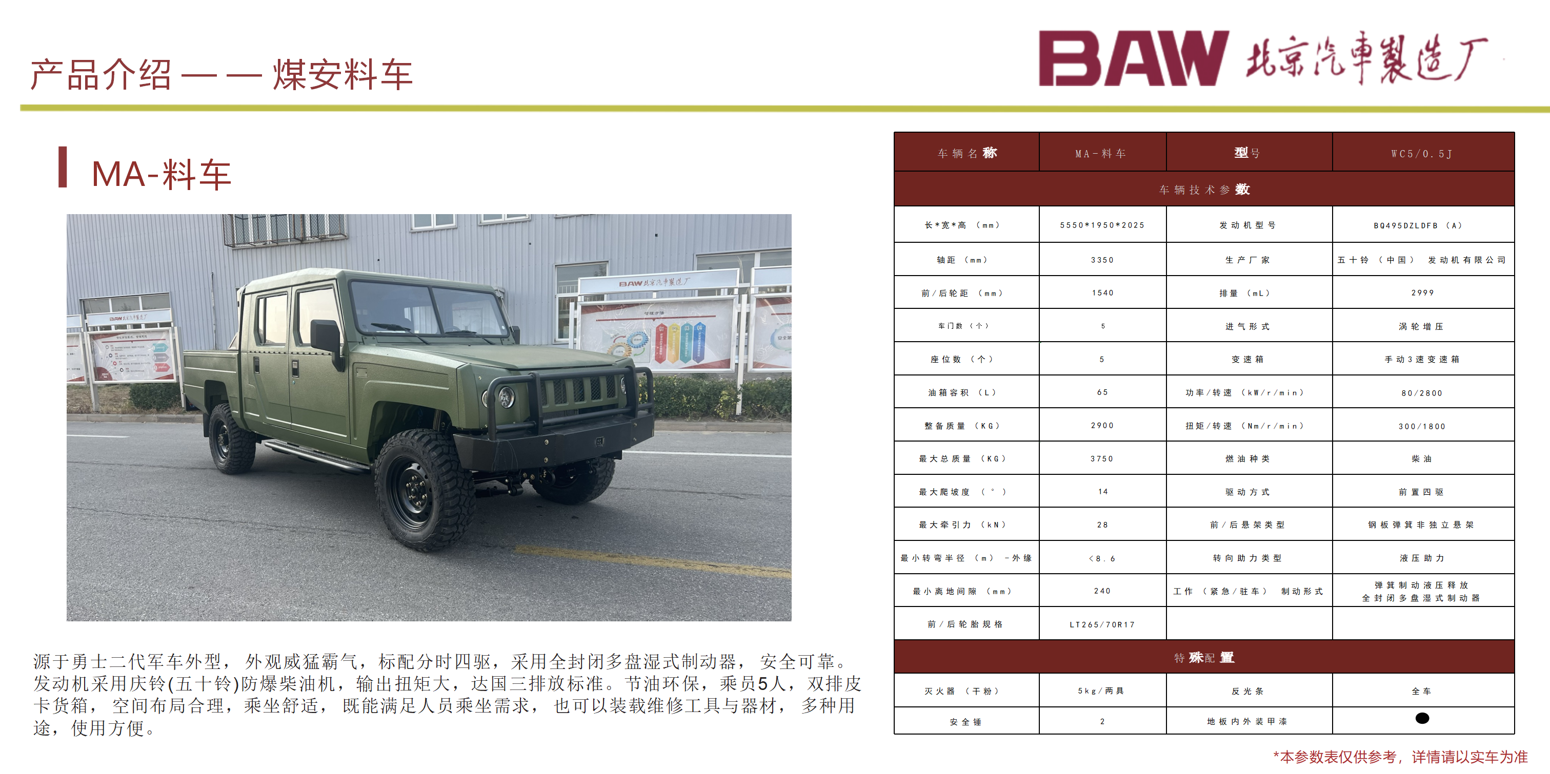 煤安車系列源于勇士二代軍車外型, 外觀威猛霸氣,標配分時四驅,采用全封閉多盤濕式制動器, 安全可靠。發動機采用慶鈴(五十鈴)防爆柴油機,輸出扭矩大,達國三排放標準。